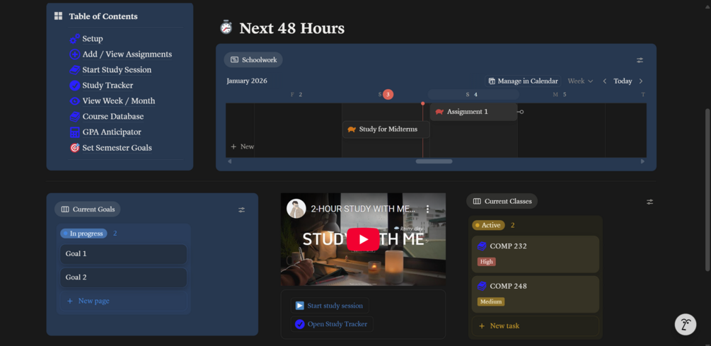 Instead of juggling multiple tools, everything you need for the semester lives in one clear dashboard: courses, assignments, study tracking, and GPA planning.